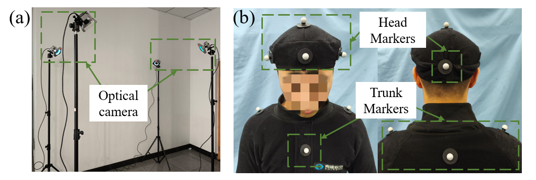 运动信息采集采用的是CHINGMU上海青瞳视觉科技有限公司开发的光学式运动捕捉系统。该系统配备了4台高速光学相机(MC4000),以110Hz的采样频率记录头部运动信息,运动捕捉系统如图2(a)所示。如图2(b)所示,在被试的躯干和头部共放置了9个标记点(Marker),高速摄像机捕捉标记点的时变位置信息,再由采集软件导出位置变化数据,进而通过计算得到头部的运动范围。