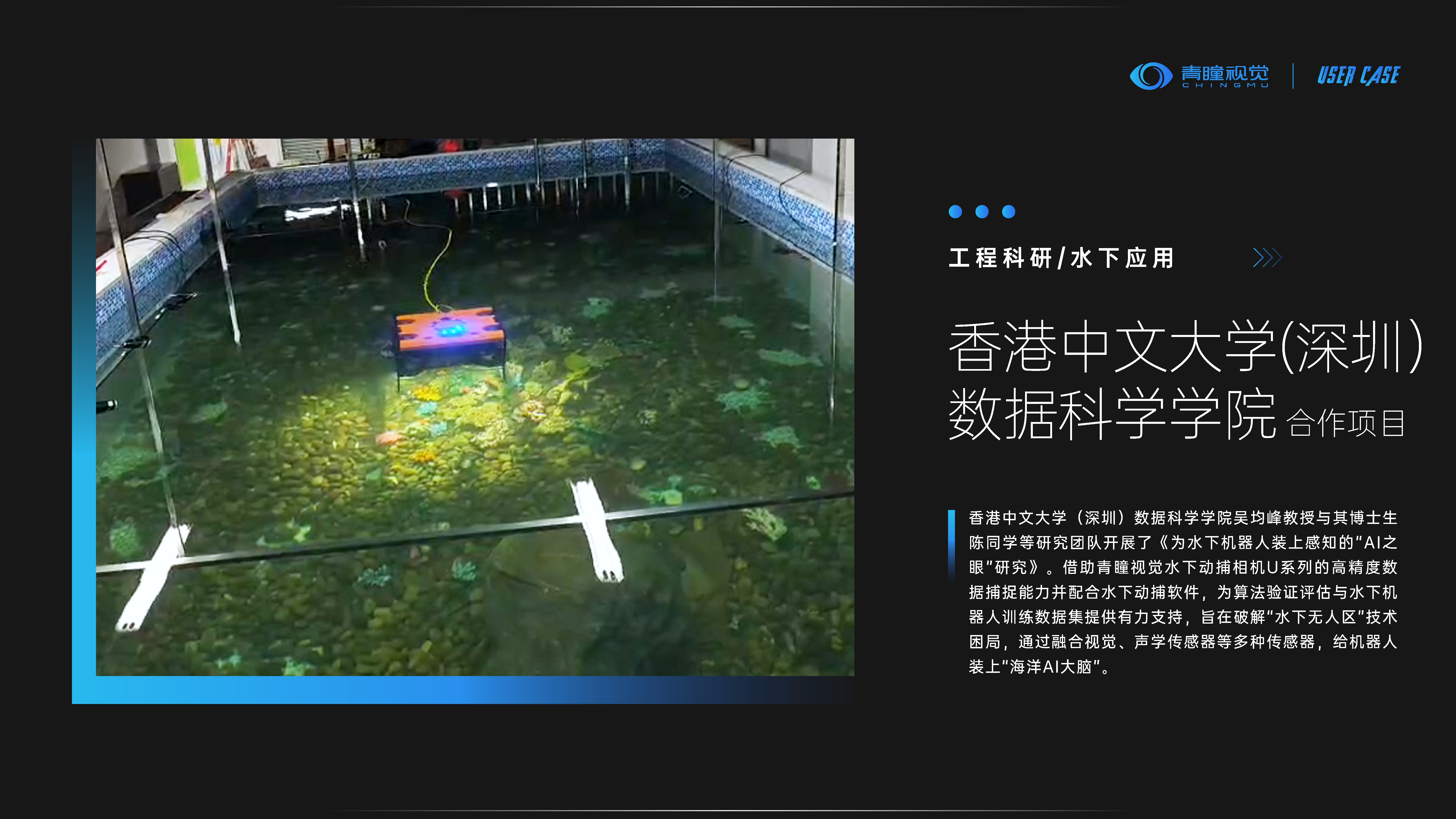 为解决上述问题,香港中文大学(深圳)数据科学学院吴均峰教授与其博士生陈同学等研究团队开展了《为水下机器人装上感知的“AI之眼”研究》。借助青瞳视觉水下动捕相机U系列的高精度数据捕捉能力并配合水下动捕软件,为算法验证评估与水下机器人训练数据集提供有力支持,旨在破解“水下无人区”技术困局,通过融合视觉、声学传感器等多种传感器,给机器人装上“海洋AI大脑”,让机器人能够在复杂的水下环境中进行自主导航和任务执行,为AI技术在海洋领域的应用注入新的可能。