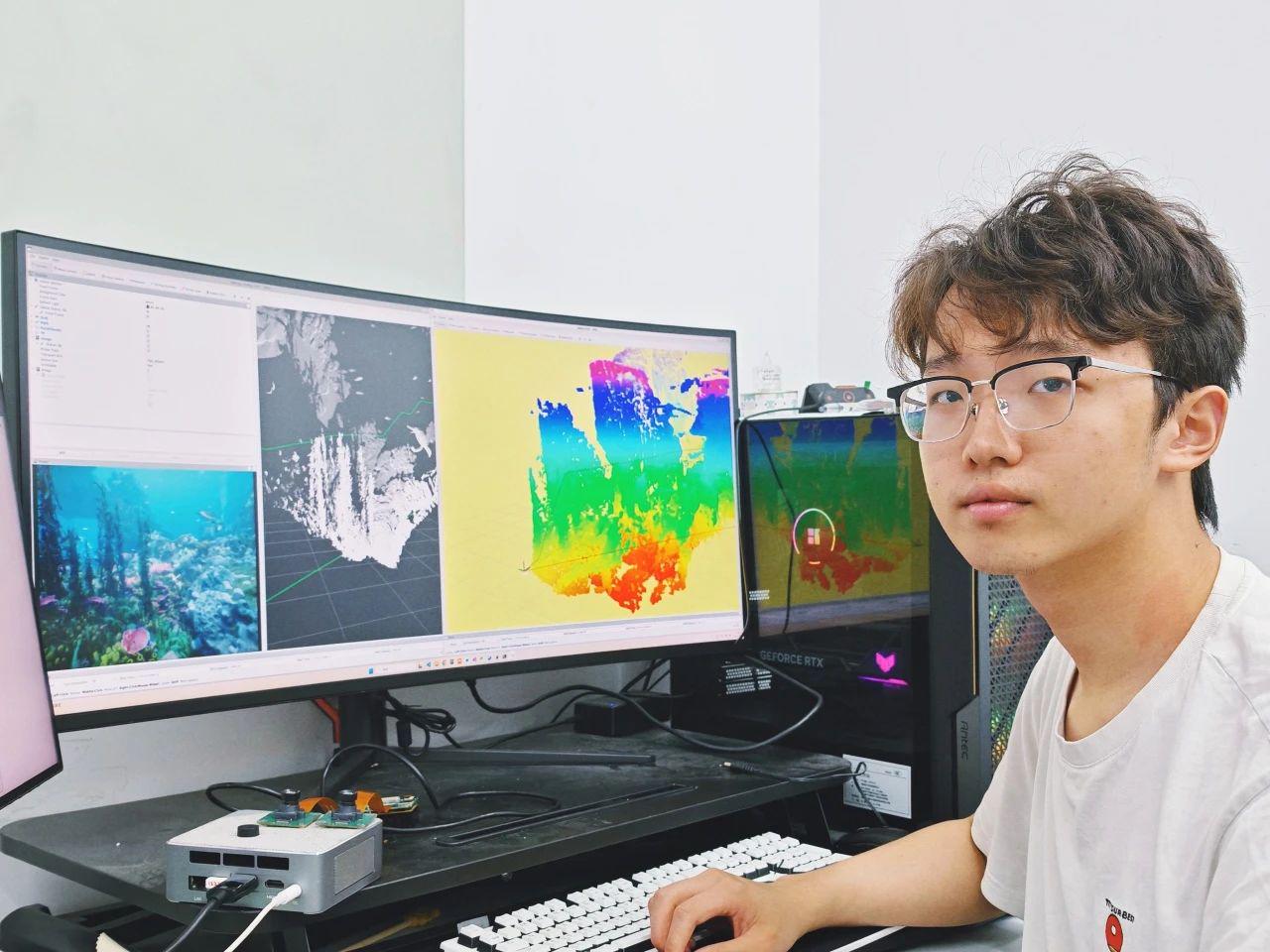 UE5 仿真测试平台搭建:博士生陈同学基于UE5构建了全面的仿真测试平台,利用UE5先进的物理引擎和渲染系统,生成高度逼真的海底场景,包括复杂地形、珊瑚水草等植被和沉积物等细节。系统能够模拟不同浑浊度的水下环境,并实时输出高质量的深度图像和模拟声呐数据,这为快速验证水下机器人的感知、定位、导航算法提供了仿真基础。