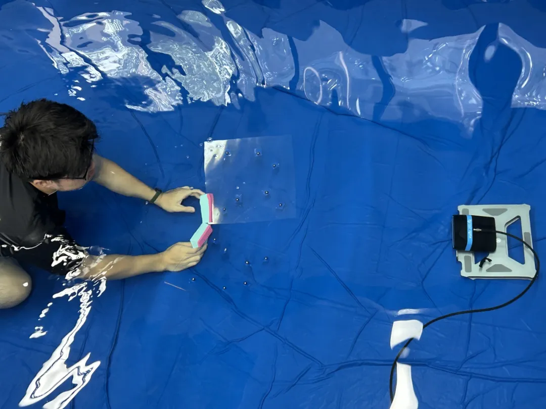 实验设计:在实验室的方形试验池底铺设带有精密反声学结构的标定装置,搭载前视成像声呐的机器人对其进行扫描,同时持续发射高频声波信号并采集反射特征。